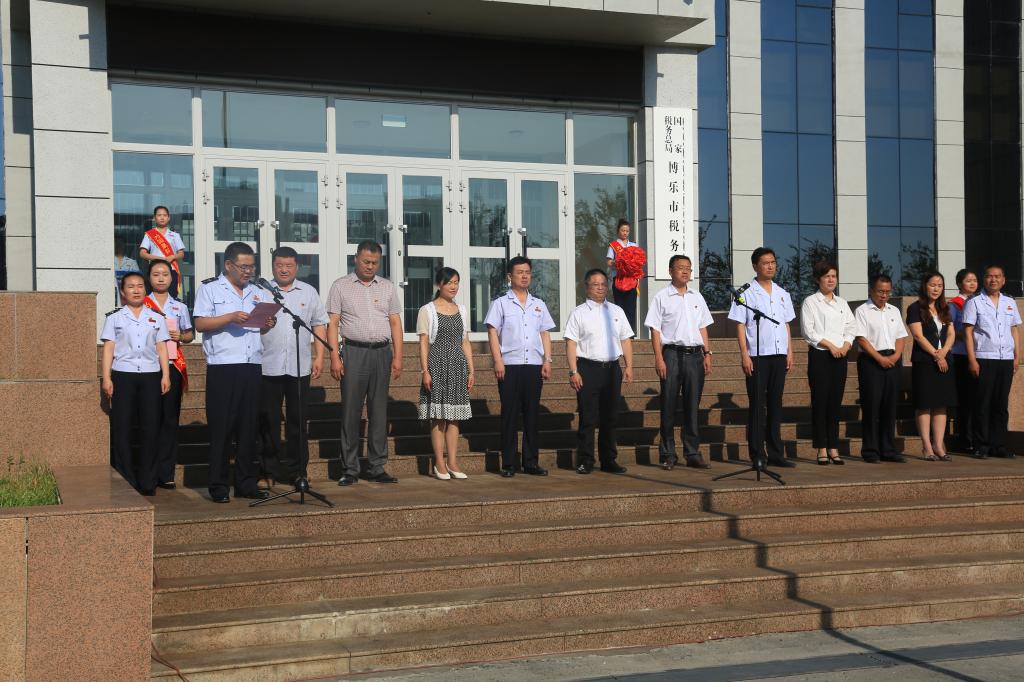 7月20日上午,博乐市税务干部们在升国旗、唱国歌仪式后,共同见证博乐市税收发展史上一个重要的历史时刻——国家税务总局博乐市税务局在博乐市挂牌成立,原博乐市国家税务局、博乐市地方税务局正式合并。