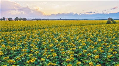 埃勒木图村耕地面积1950亩,今年, 该村种植食葵1100亩。7月中下旬,食葵盛开,形成了一片金灿灿的花海,蔚为壮观。 (通讯员秦美忠 摄)