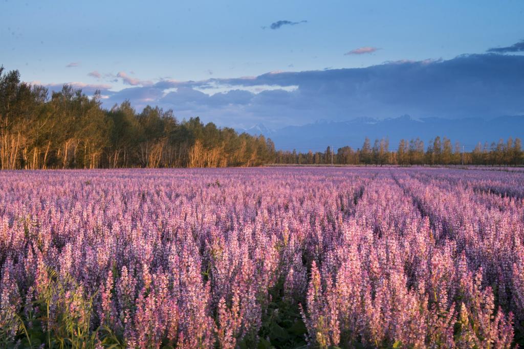 温泉的色彩也是令人目不暇接,碧绿的草原,纯净的蓝天白云,金色的麦田,各色的小花儿,层次分明的青山绿水、森林河谷,更有我们眼前这视觉冲击力极强的万亩紫色花海。