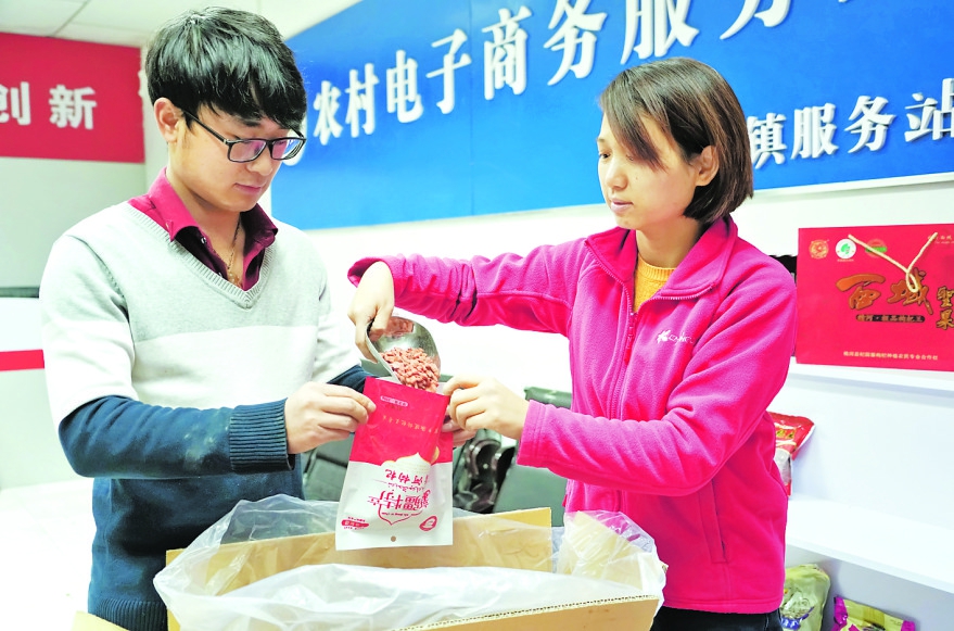12月19日,精河县托里镇农村电子商务服务站负责人温露(右)和同事在包装枸杞产品,准备寄往内地。