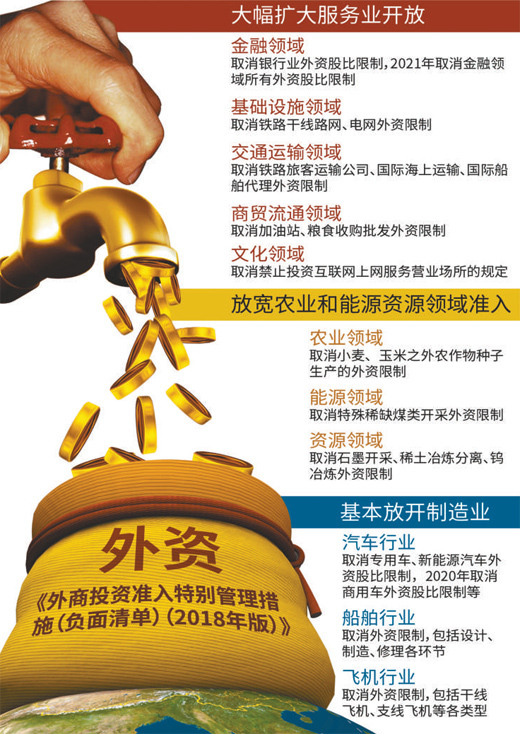 大幅扩大服务业开放、基本放开制造业、放宽农业和能源资源领域准入……新修订的2018年版外商投资准入负面清单6月底正式出炉。与2017年版相比,新版负面清单从63条减少到48条,明确在22个领域大幅度放宽市场准入。