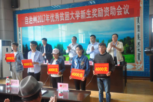 2017年8月26日,自治州2017年优秀贫困大学新生奖励资助会议在州蒙古中学一楼阶梯教室举行,出席会议的领导有:州扶贫办吐布新巴图,州民政局副调研员巴特尔同志,州财政局副调研员周效军同志,州教育局局长图格杰。今年共有77名优秀贫困大学新生获得4000元的资助,其中州、县(市)财政按3:1承担,资助总额达到30.8万元。